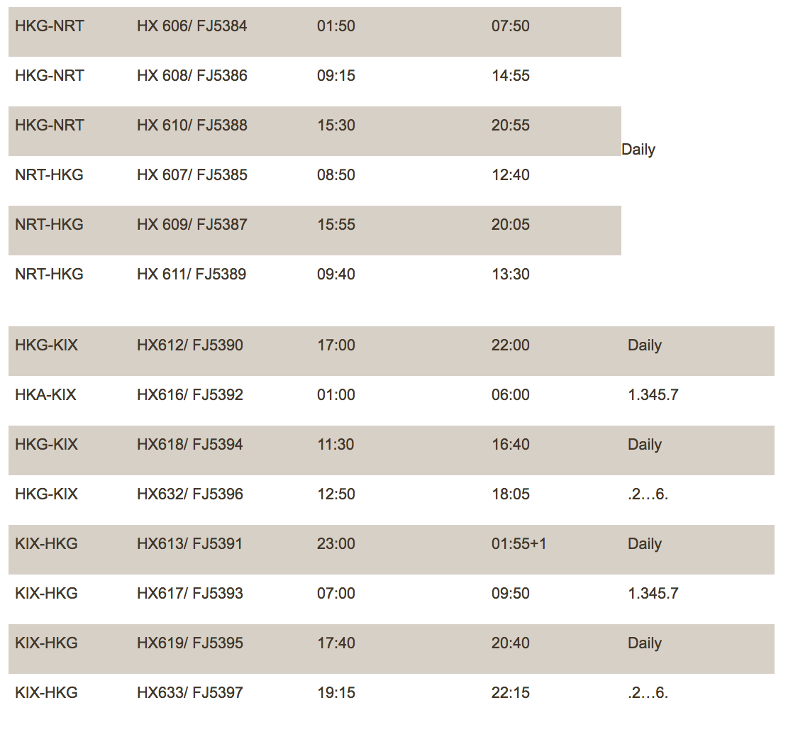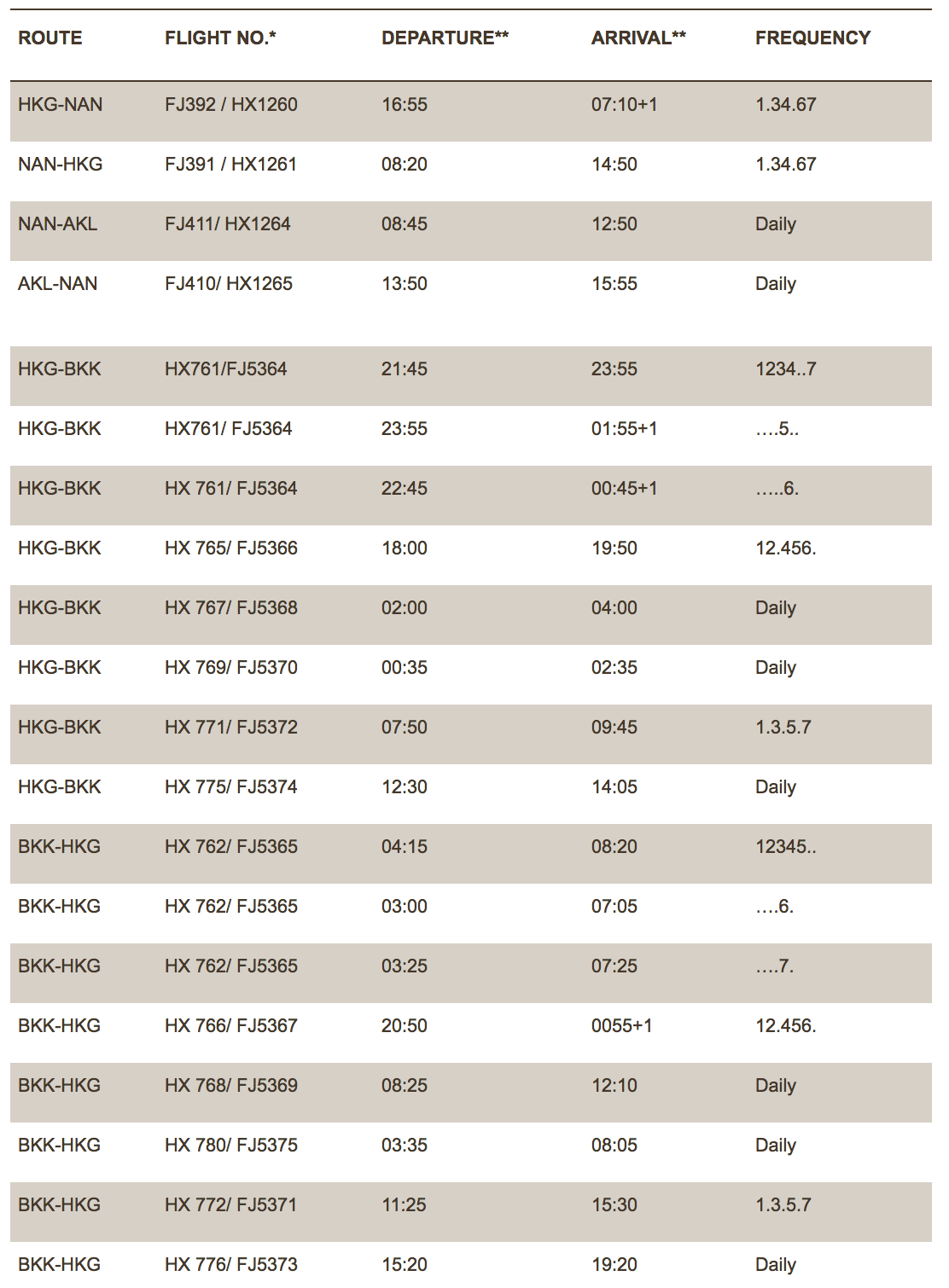 Details of the Codeshare flights between Hong Kong Airlines and Fiji Airways: