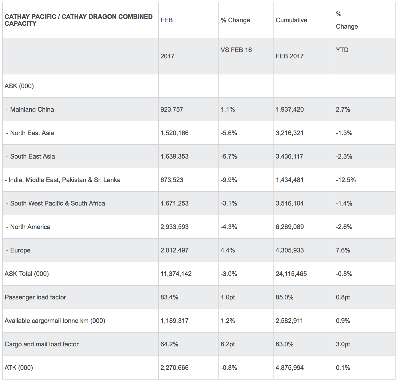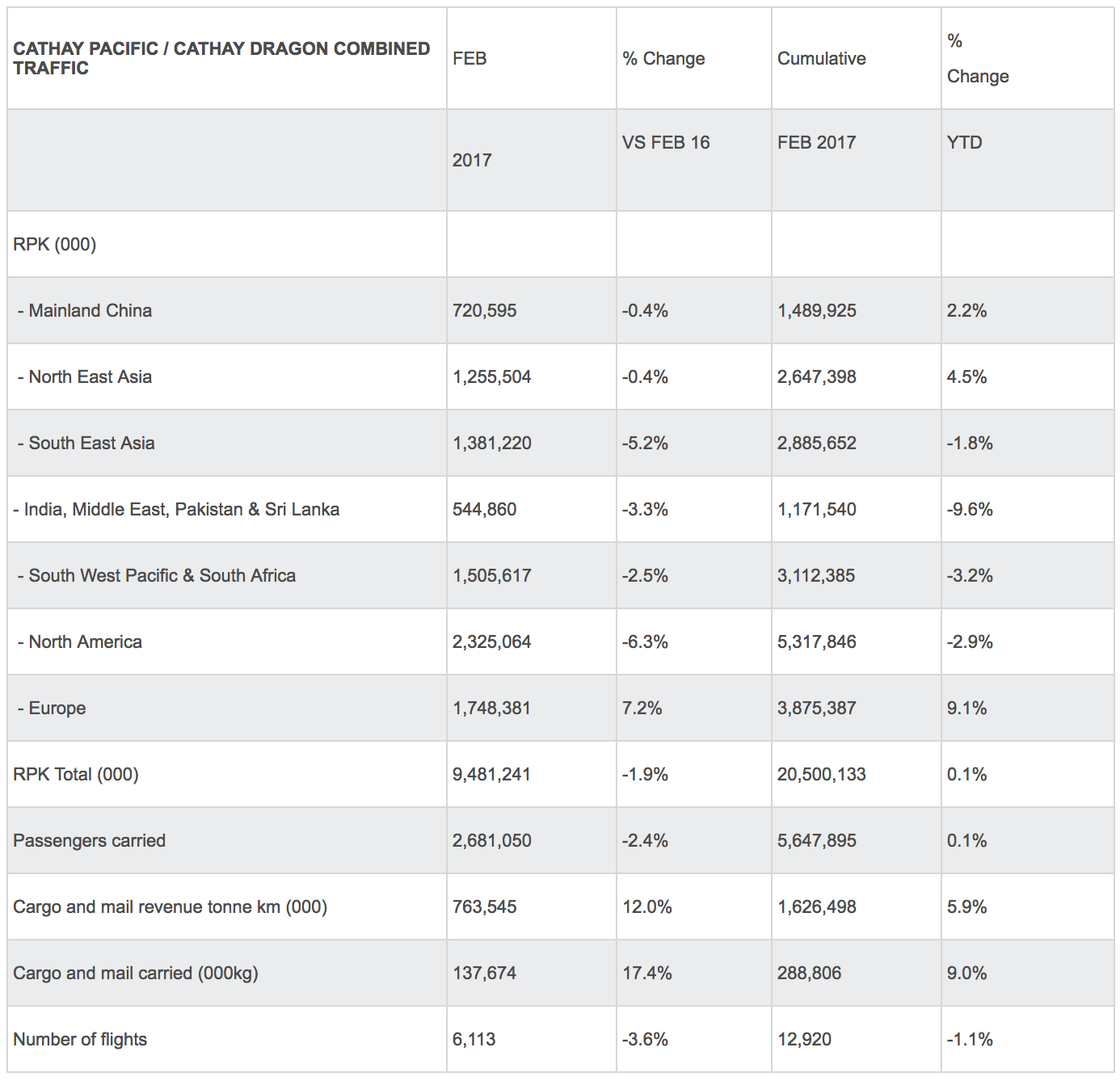 Cathay Pacific Airways today released combined Cathay Pacific and Cathay Dragon traffic figures for February 2017 that show a decrease in the number of passengers carried and an increase in cargo and mail uplifted compared to the same month in 2016.